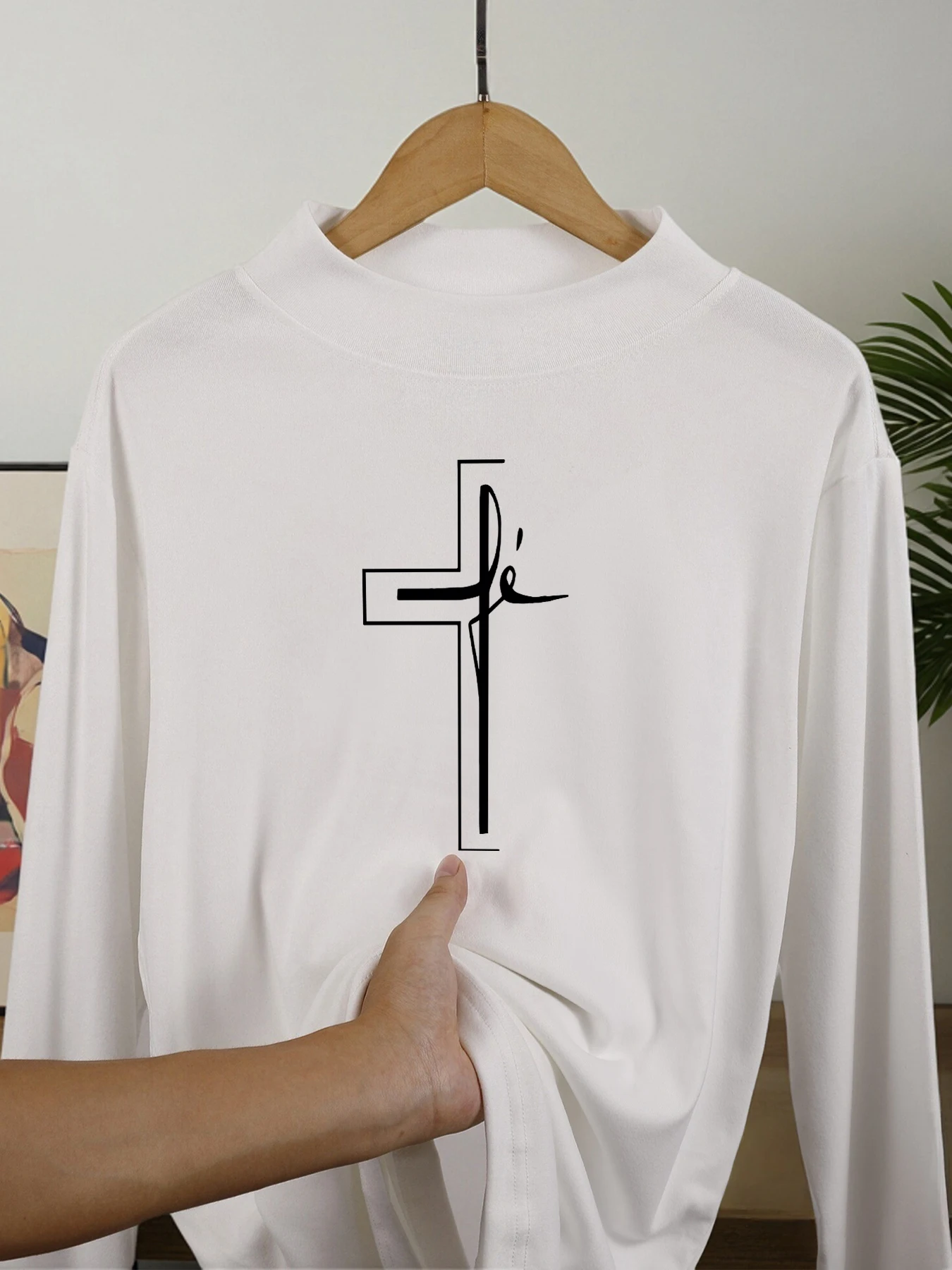 Elegant Faith Design: Features a stylish, thin-line Christian cross integrated with the word “Fé” (Faith) in a modern script font.
