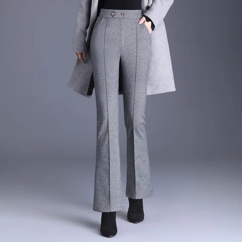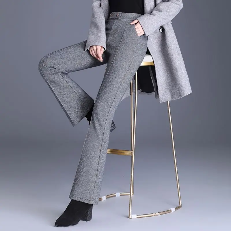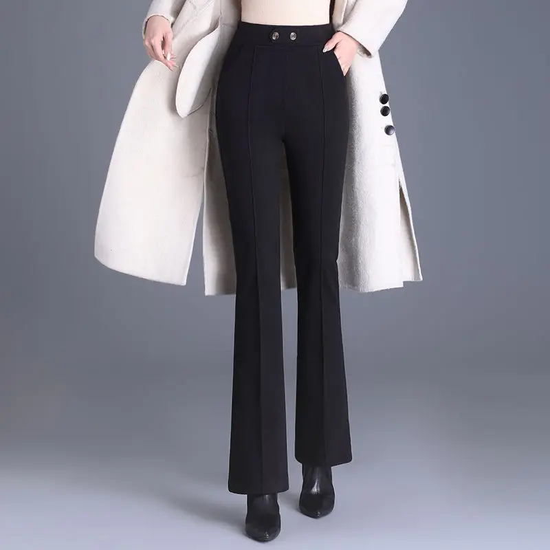 What sets these trousers apart is the precision-stitched front crease, which transitions into a graceful flare at the hem. This “flare” or “bootcut” design is timeless, offering a silhouette that balances the hips and creates the illusion of longer legs. Whether you are heading to a boardroom presentation or a sophisticated dinner, these trousers provide a sleek, “boss-lady” vibe that never goes out of style.