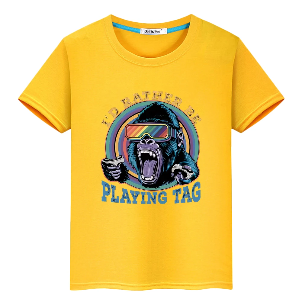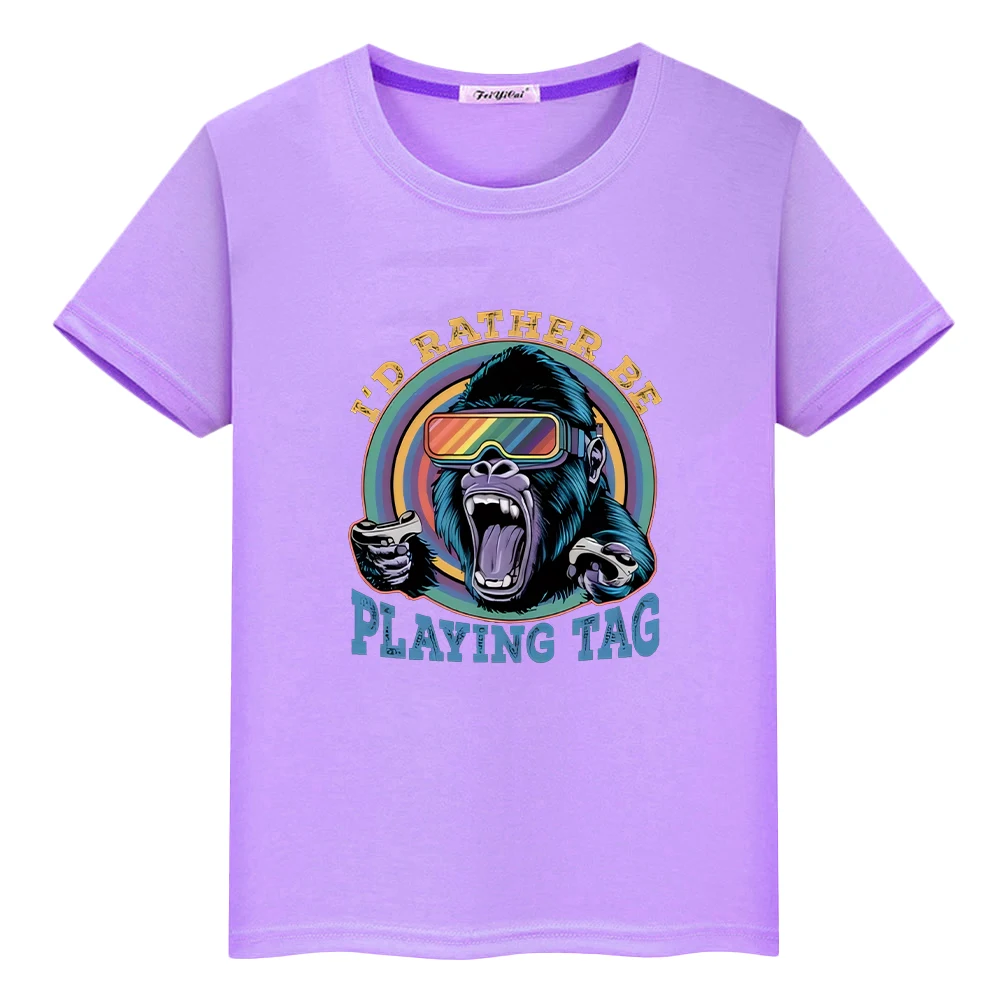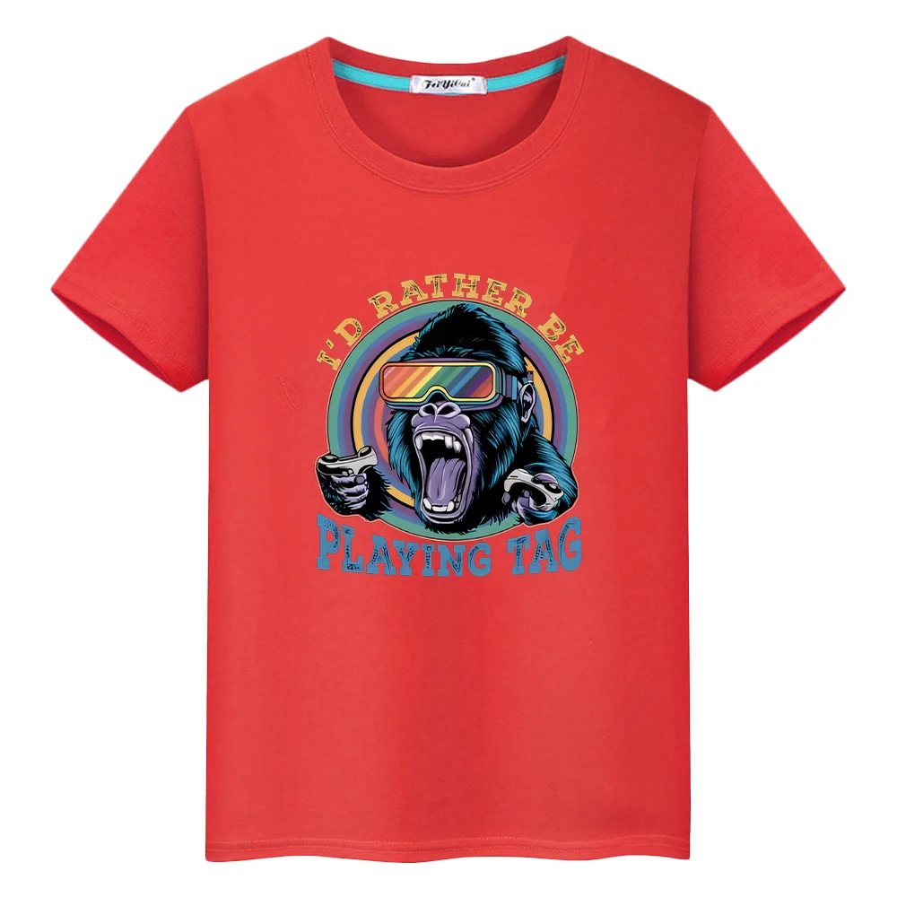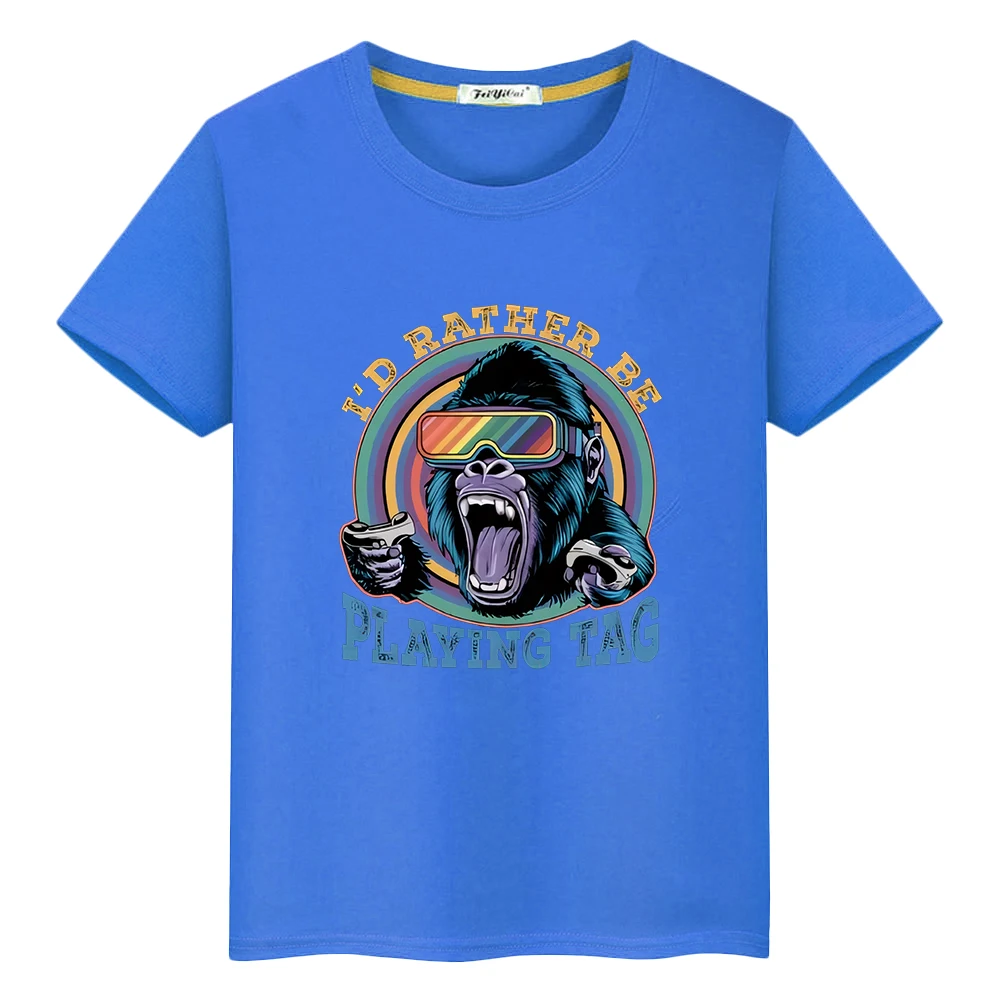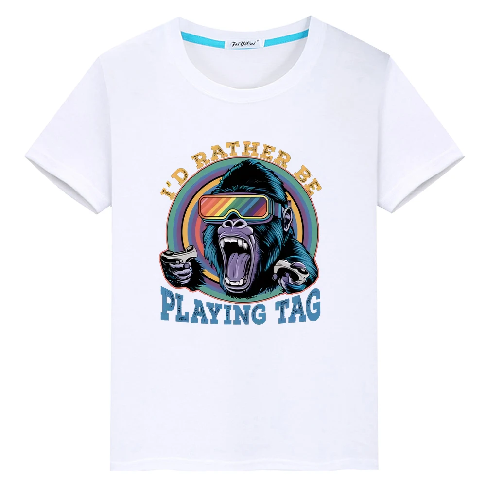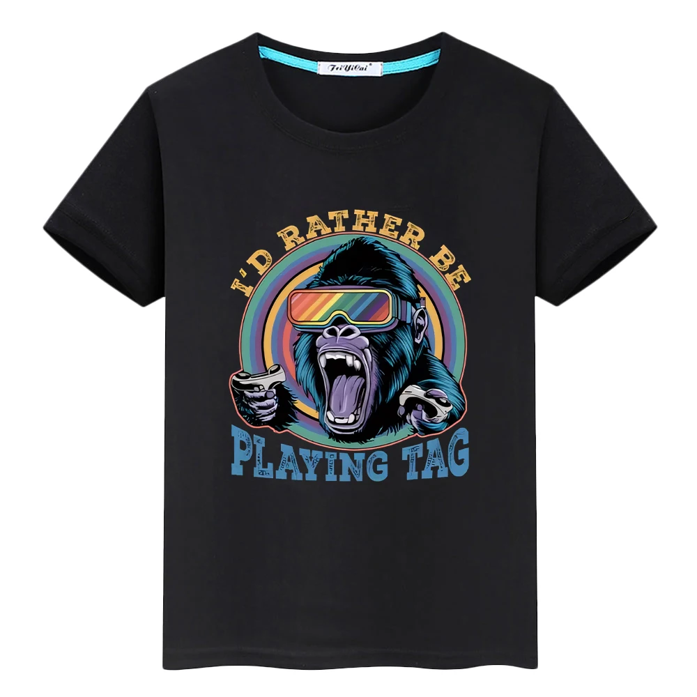 Step into the world of virtual reality style with our “I’d Rather Be Playing Tag” Gorilla Graphic Tee. Perfect for fans of immersive gaming and retro aesthetics alike, this shirt captures the high-energy spirit of modern VR culture. The centerpiece features a stylized, roaring gorilla equipped with rainbow-tinted VR goggles, set against a classic “synthwave” sunset-style ring.