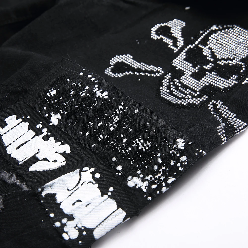 Elevate your streetwear game with these Urban Edge Distressed Black Jeans, designed for those who want to make a statement. These aren’t just your average pair of denim; they are a blend of rebellious style and modern tailoring. Featuring a striking skull-and-crossbones graphic on the thigh and edgy white typographic prints, these jeans capture a raw, “grunge” aesthetic that stands out in any crowd.